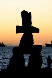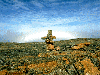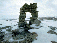 Canada's excellent Museum of Civilization has documented, through the photographs and text of enthnogeographer Norman Hallendy, the stark, stunning beauty of numerous examples of Inuksuit and other rock and stoneworks by the Inuit of the Arctic regions. The online (and travelling) exhibition, Places of Power: Objects of Veneration in the Canadian Arctic describes the images directly below (and many more) in great depth and detail. Even the casual observor might imagine the full figures that could have towered in ancient times above what may today be only remnants of their bases. More images and text are featured in Mr. Hallendy's book, Inuksuit: Silent Messengers of the Arctic. These images are shown on this site by direct permission of the author, and should not be used anywhere else without such permission.