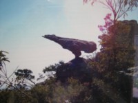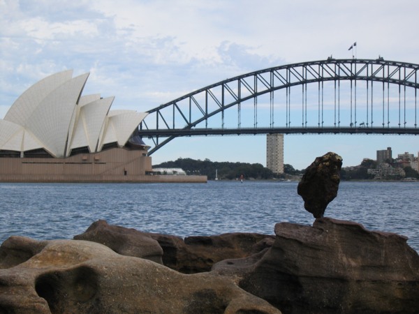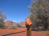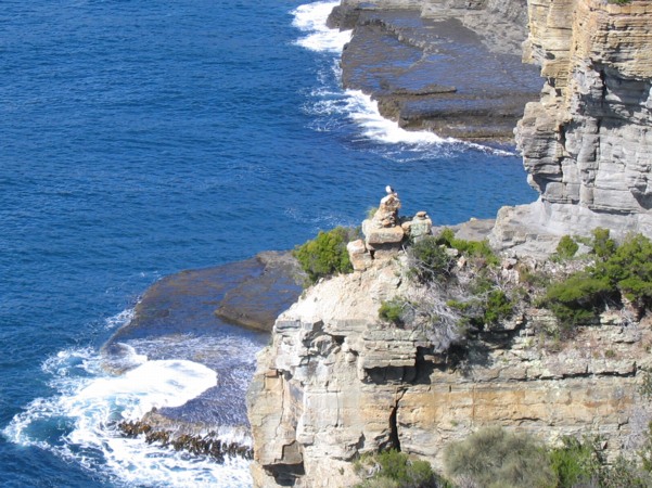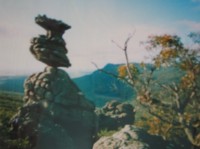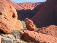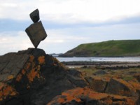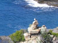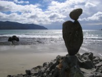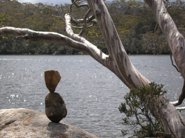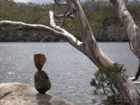 Australia's Aboriginals are not known to have made rock and stone structures other than for religious purposes, such as Dreamtime ground paintings. Few outsiders have seen such permanent installations, but they are reported to be in some cases enormous. Seemingly natural balances occur throughout the vast landscape of the country, and John Parker, an employee at McKenzie Falls, Gariwerd-Grampians National Park, Victoria, has generously provided the three images below from Asses Ears Mountain Range. Other examples frequently offer tantalizing hints of human impact over the millennia. And Australia's surfers have begun to balance, as well.