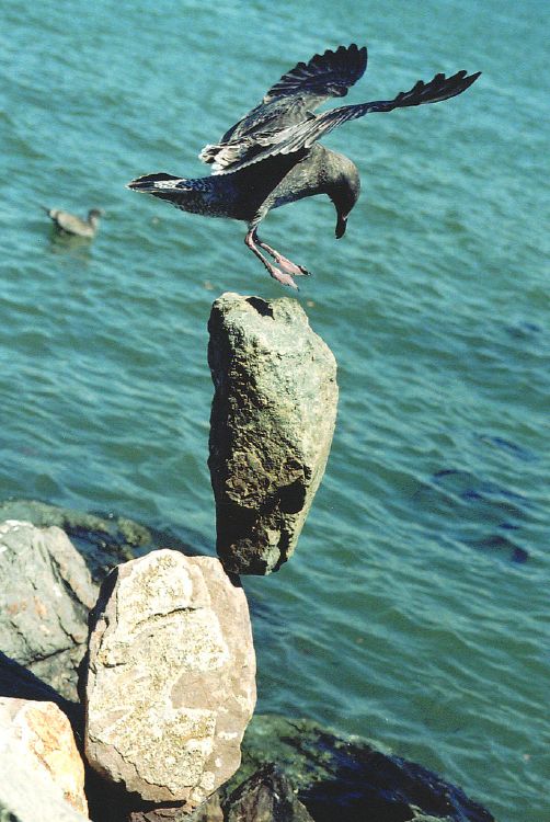 "You'll be surprised if I tell you that I think that birds are smart enough (unlike some of their human counterparts) to land on balanced rocks that they think are going to support their weight. Over the time that I've been balancing rocks in Sausalito, maybe 50 times or so birds have landed on the rocks - and maybe only 5 times the rocks have gone down. Normally I build 10 or so different structures of balanced rocks - bigger sizes, medium sizes, and small sizes. 99% of the time the birds go and land on the bigger and taller ones. And they know - they seem to understand - how to land "properly": very slowly and softly, landing almost 100% vertically downward - not landing with a sideways approach. They land straight down to the right point and balance themself with the rocks. How about that!"