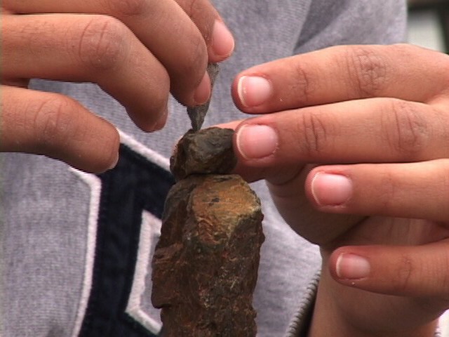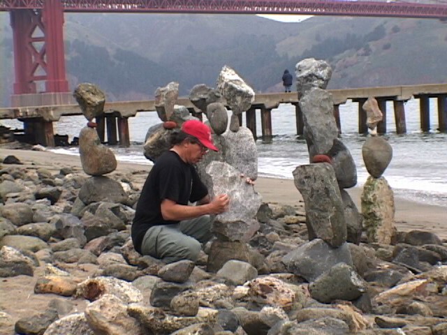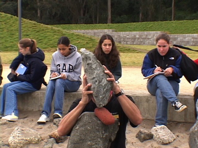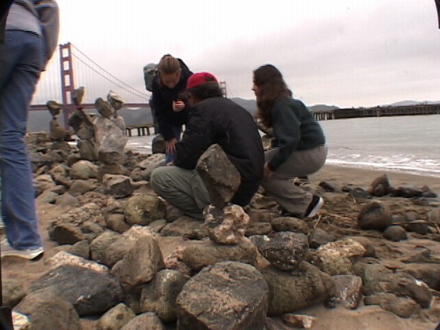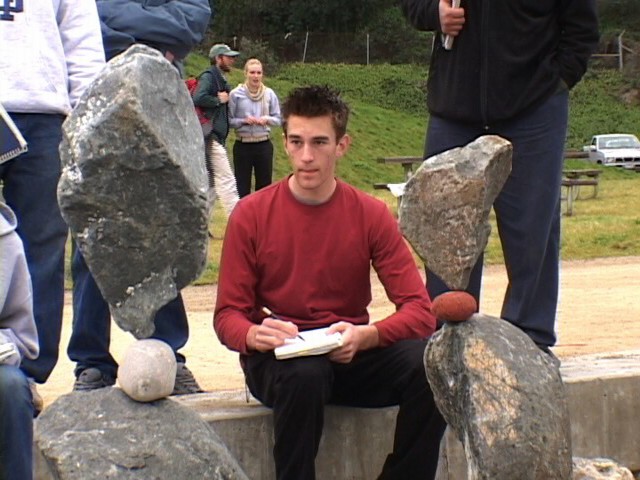 "Ever in search of the timely, provocative prompt, Jennifer Starkweather and I arranged to have our classes meet Bill Dan one grey morning in mid-February. Twenty-six students, from Painting and English 9b, admired several pieces he had prepared before our arrival, and then, while he worked, they painted, sketched, and wrote poems. The painters were working on abstraction and environment, the poets on vivid, suggestive language. Both groups were challenged to pursue imagery and imaginative association rather than description, to craft work less about the balanced stones and the magnificent site than born out of them. Less report, more response. The students were quiet, focused, engaged. Naturally, some tried their hands at Bill Dan's endeavor. Nicely, he helped."