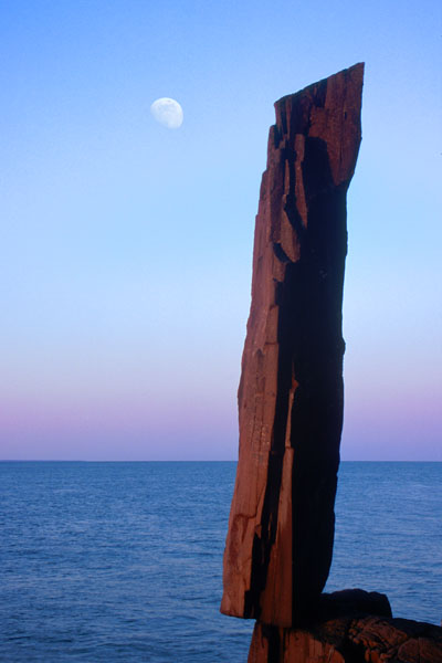 On Long Island in Nova Scotia, the Balancing Rock is an immense basalt column left standing where the surrounding columns have fallen away over time. This unique formation was suggested for this website by a resident of the province, who writes, "There is a hiking trail that goes right out past the base of the rock along the edge of the water and people can get right up to the rock if they are in the area." The stunning photographs (open the second, larger view) shown here are provided courtesy Mirrorlock Photography.