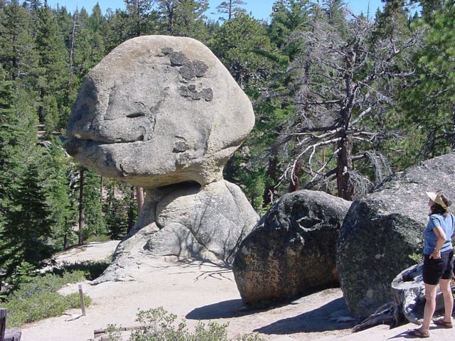 The glacial ice of the Pleistocene and the annual 18ft snowfall of the High Sierra have so weakened the "joint line" along this granite boulder at California's D. L. Bliss State Park that it will topple before long.