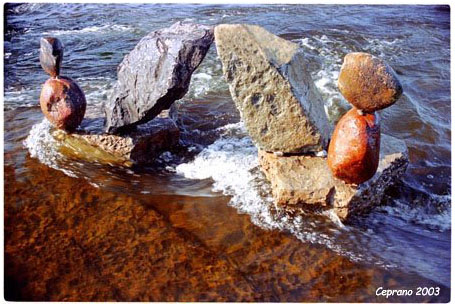 Beginning with ancient limestone from the site, he annually builds his pieces by hand, balanced and shimmed where necessary. Although the towering sculptures are not intended to be permanent, and their temporal quality is intrinsic to the art, public safety and contractual concerns require them to be "stabilized" after completion. Unlike his installed commercial and private work, no epoxy or metal rods are used in the current river pieces, which ordinarily last only one season.
