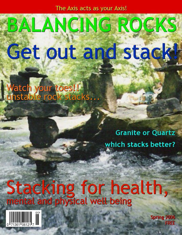 The two examples on the left and at center above were created by the rock-on-rock-on.com webmaster (on left) and (center) by Joe Hill, a member of the Western North Carolina Rock Stackers who was the first to take the bait and run with it. The cover on the right was a mock-up done by professional stonemason Tomas Lipps (see his work on the bottom right corner of the Occasional Balancers page), who has published an issue of his real-world magazine Stonexus, featuring articles about balancing and balancers (look for Issue 7 there!).